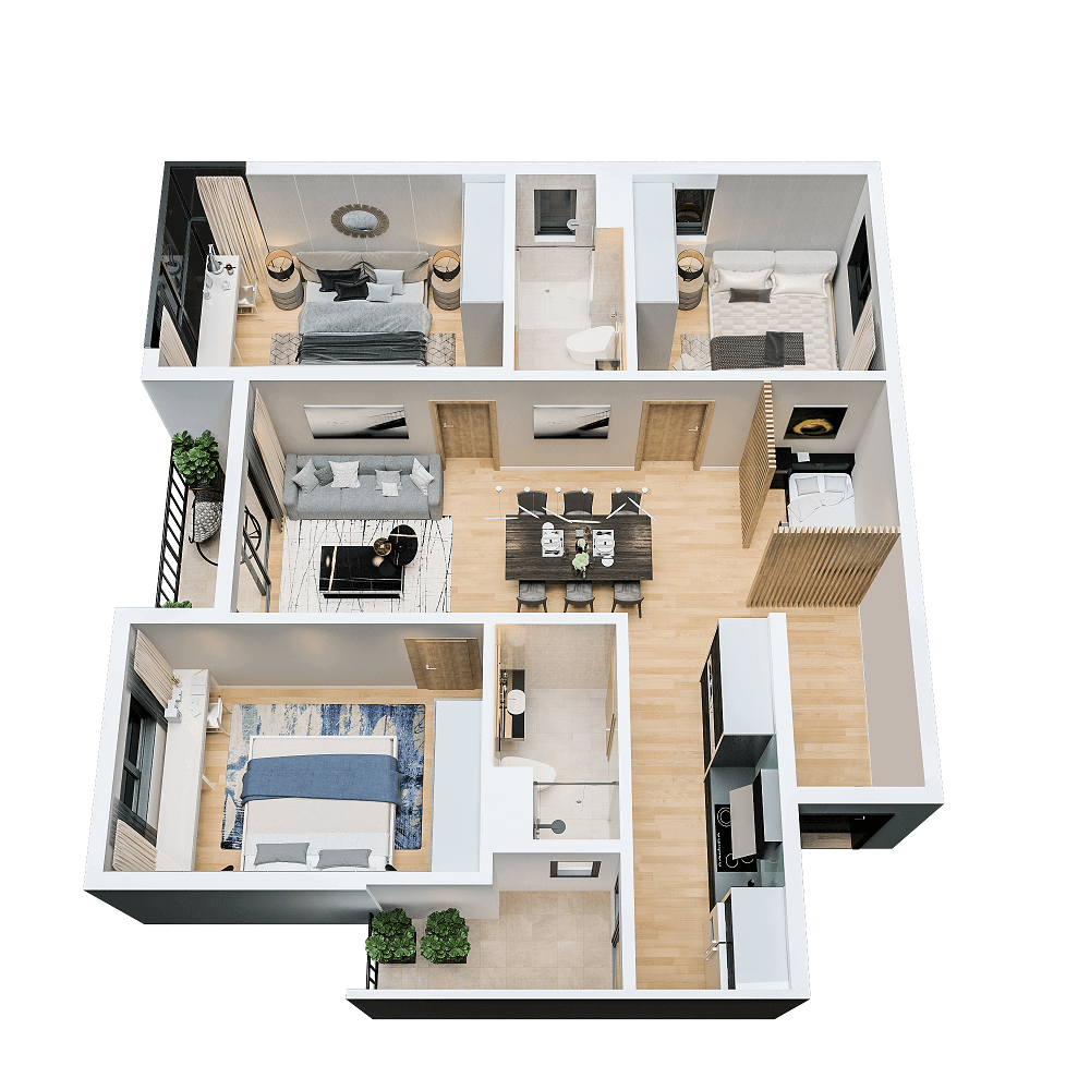 Thiết kế 3D căn hộ căn hộ 3PN căn C1, diện tích 93.09m2 căn hộ chung cư The Zen Residence