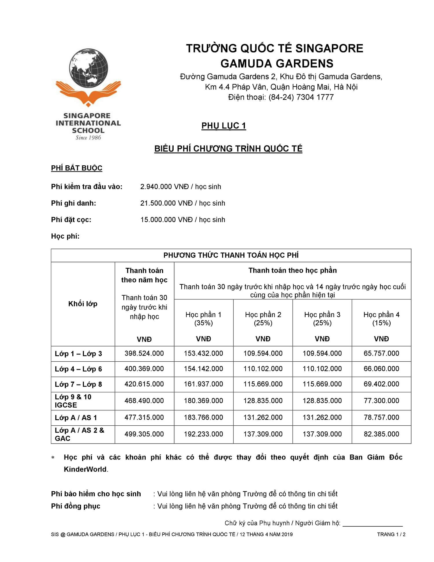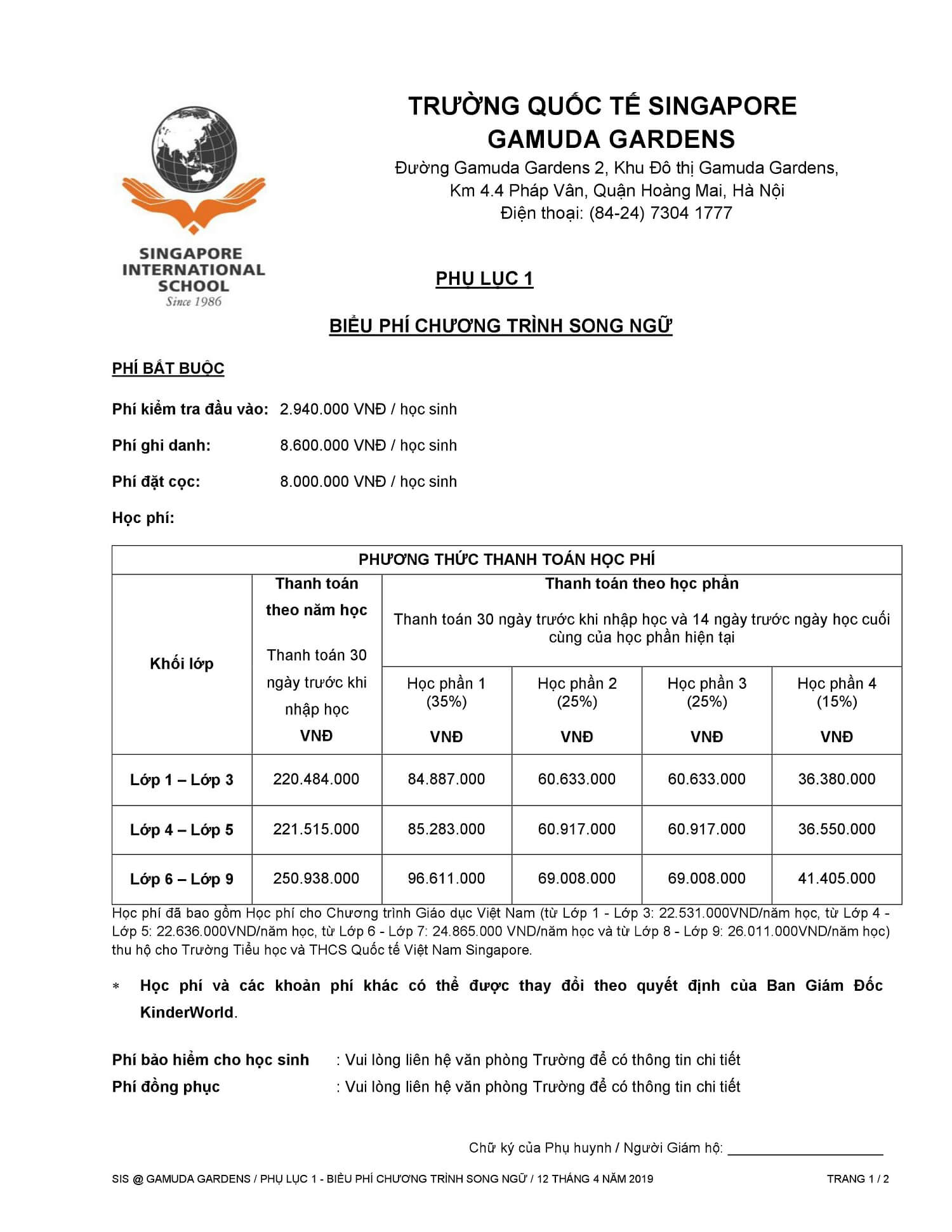 Xin vui lòng xem Biểu Học phí của trường học Singapore SIS Khu đô thị Gamuda Gardens