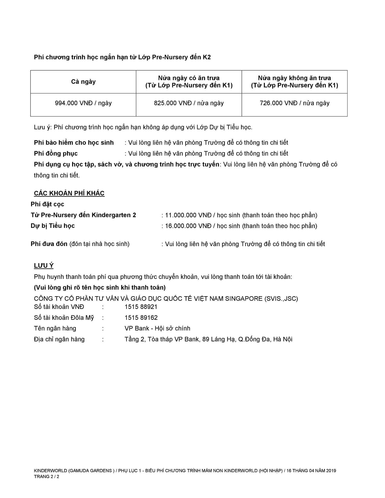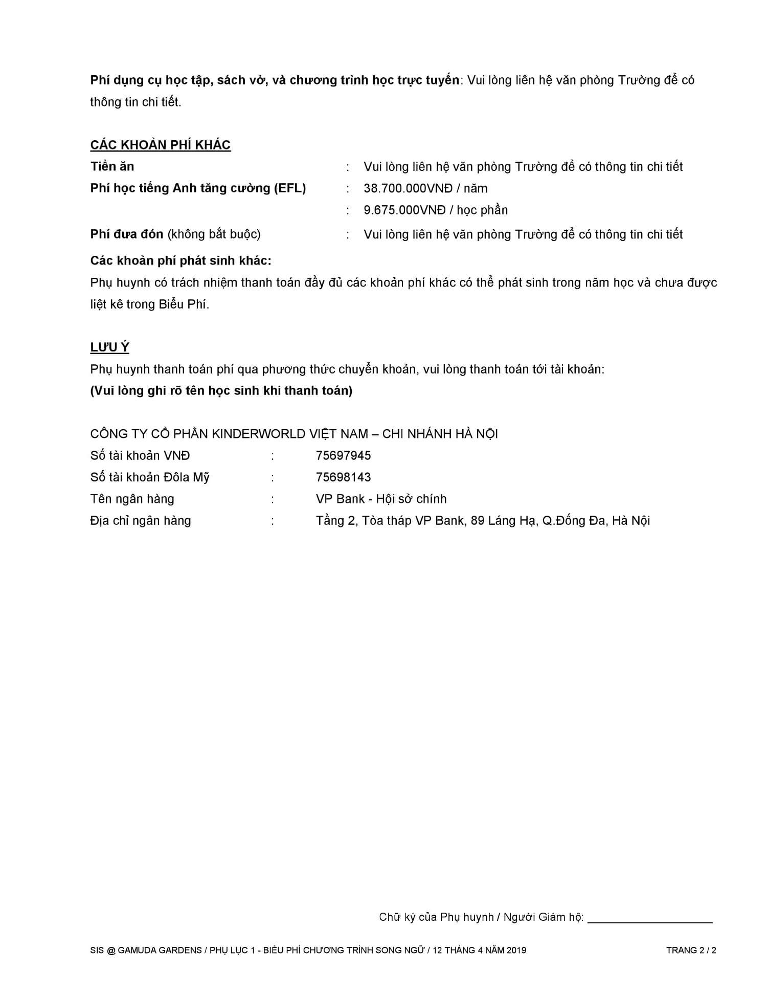BIỂU PHÍ CHƯƠNG TRÌNH SONG NGỮ