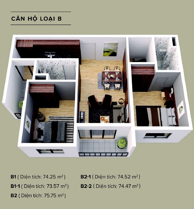 - Căn 07, diện tích 74.25m2, view cổng chính, Hướng ban công Đông Bắc – Cửa Tây Nam.