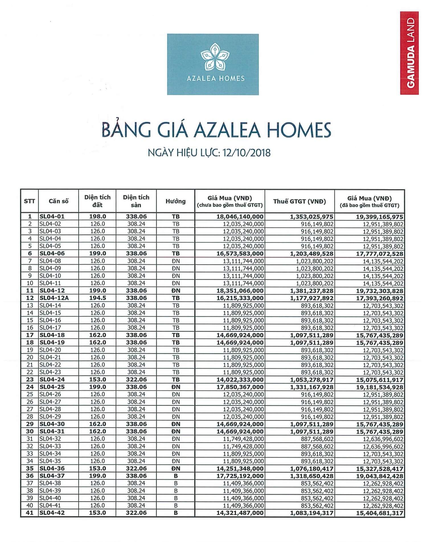 Bảng giá 42 căn biệt thự song lập Azalea Homes: