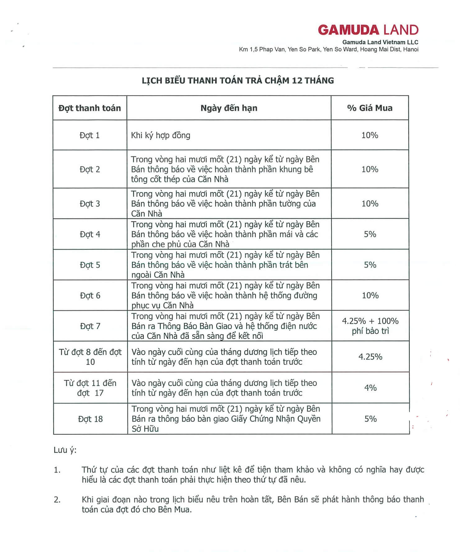 Tiến độ thanh toán trả chậm 12 tháng biệt thự song lập SD42 – Azalea Homes