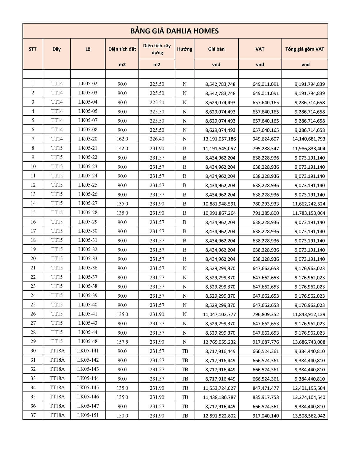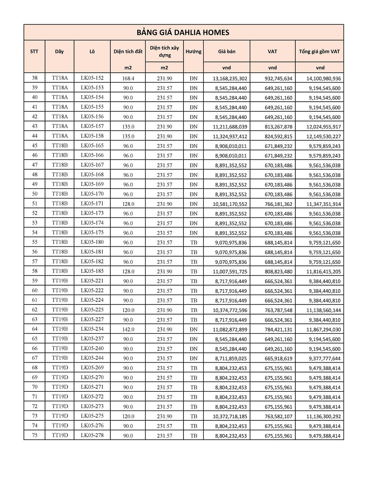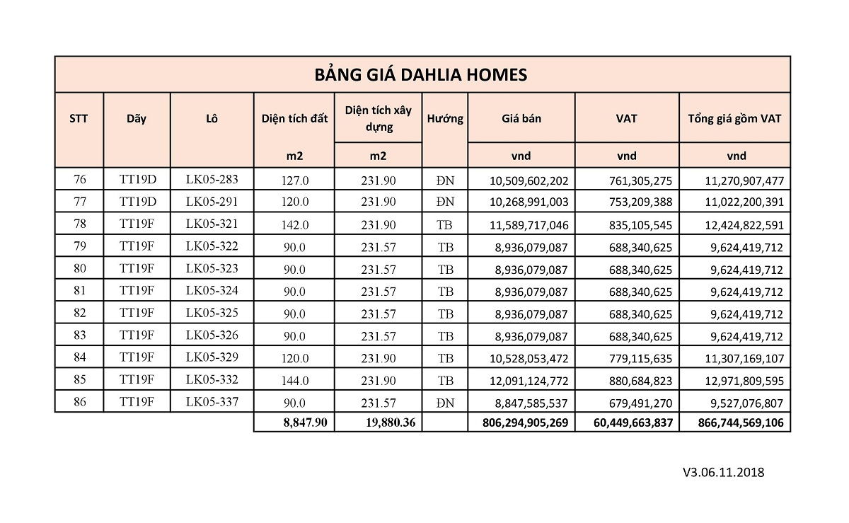 Bảng giá liền kề Dahlia Homes ( Hoa Thược Dược )