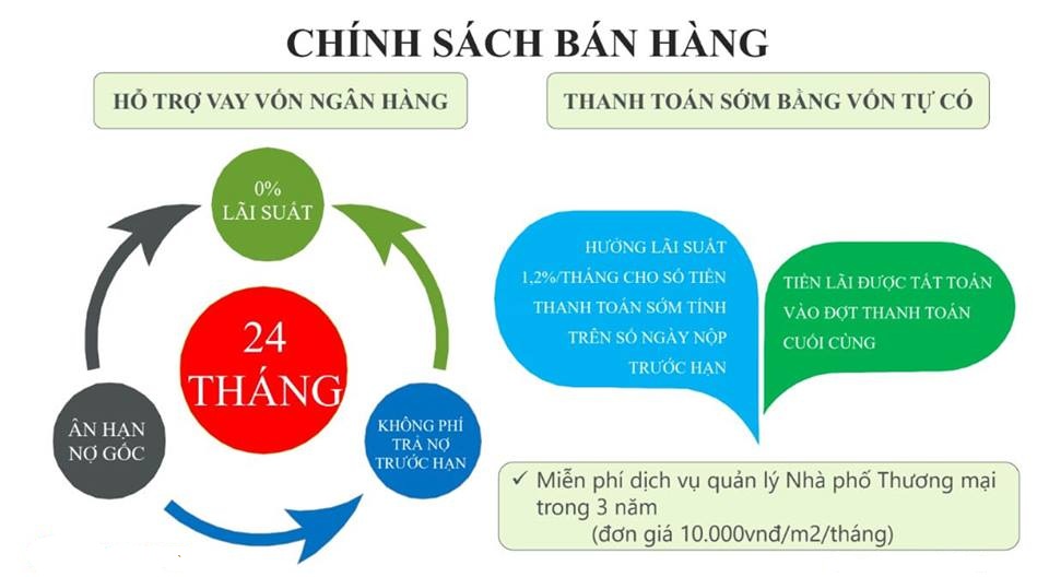 Anh chị cần 3 Tỷ để thanh toán đợt 1, Số còn lại 65% được Ngân hàng hỗ trợ với LS 0% trong 2 năm, ân hạn, miễn phí trả nợ cũng trong 2 năm.Nếu anh chị VAY NH 65% không được hỗ trợ lãi xuất tức phải vay vs LS 10%/năm. 6,5 tỷ vay trong 2 năm lãi là 1,3 Tỷ. Tức là Anh/ chị đang sở hữu lô shophouse 90m2 giá chỉ 10-1,3=8,7 tỷ !
