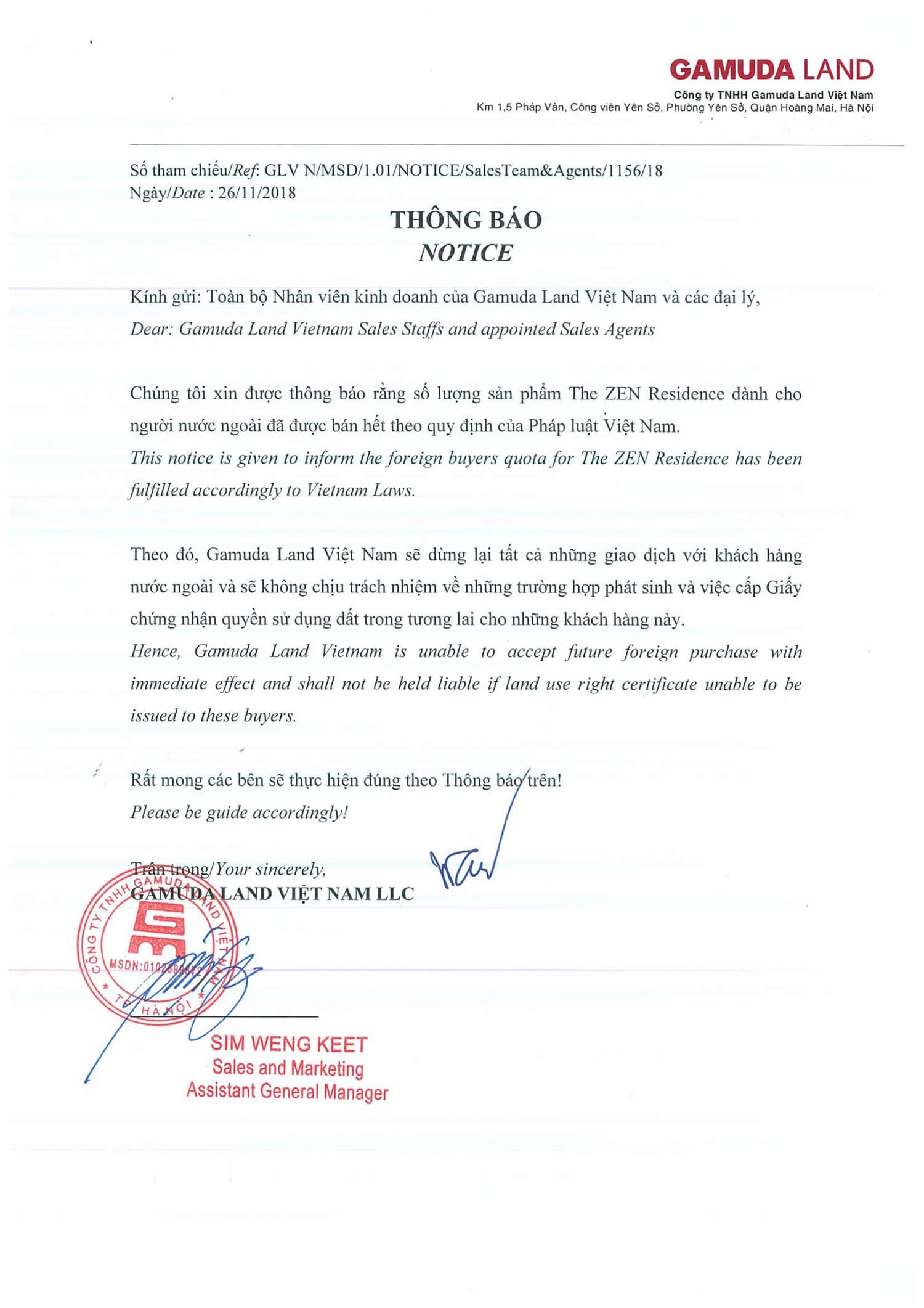 Thông báo 30% quỹ hàng The Zen Residence đã bán hết cho người nước ngoài, vì vậy quỹ hàng còn lại không đủ điều kiện theo pháp luật Việt Nam bán cho người nước ngoài.
